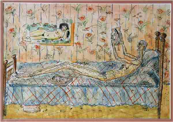 Bruno Mankowski, born in Berlin, studied at the Municipal Art School in Berlin and Ecole des Beaux-Arts in Paris before emigrating to the U.S.A. (New Jersey). He was a W.P.A. artist and exhibited widely before eventually settling in Florida. Painter, sculptor and craftsman, he engaged in many styles from classic figure studies (see Drawings) to allegorical lithographs to humorous caricatures, such as this depiction of an old hag recapturing her youth in a girlie magazine.