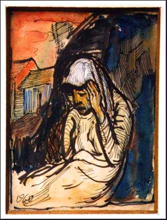 Jakob Steinhardt was born in the then remote, largely Polish town of Zerkow in the Posen District of Germany. Loss of his father at an early age and education in a Berlin boarding school engendered a deep nostalgia for the tiny houses and human warmth of his native Jewish town, a quality found in much of his later work. His mother, encouraging his artistic bent, eventually helped him be accepted as a pupil of Corinth, whom Steinhardt later idolized. A year in Paris opened his horizons, but caused him to eventually reject the impressionists: together with Meidler and Janthur he founded the "Pathetiker" group very early in the German expressionist movement. Running afoul of the Nazis, he fled to Tel-Aviv and then Jerusalem in the early 30s, eventually becoming Director of the Graphics Department at the Bezalel School of Arts and Crafts in 1949. Known primarily for his inciteful woodcuts of Jewish life, his works today hang in museums and collections around the world.