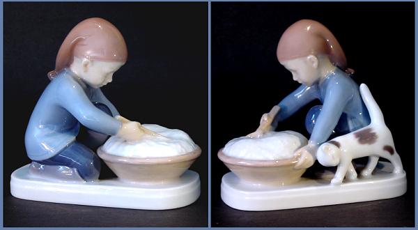 Bing and Grondahl: Boy with cat figurine (#2305). Lovely young boy in nightcap (Christmas elf), stirring porridge with his cat by his side. Marked on base with the old three castle mark above: "Danmark", "Made in Denmark", "B&G" and number: "2305". Length: 5"; height: 4¼". SOLD. (#B095) |