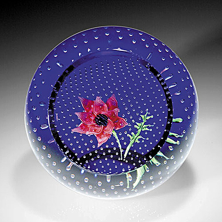 Caithness Glass: October-Anemone paperweight. A pink flower on green stem rests on a layer of evenly spaced bubbles over a translucent cobalt ground. Has a single top facet, and is signed and numbered. Diameter: 2 ". $125. (#P028) |