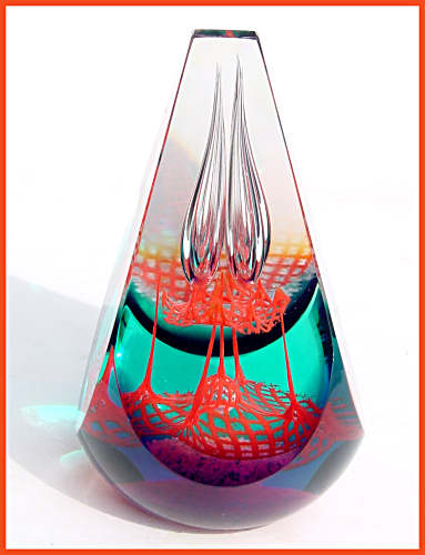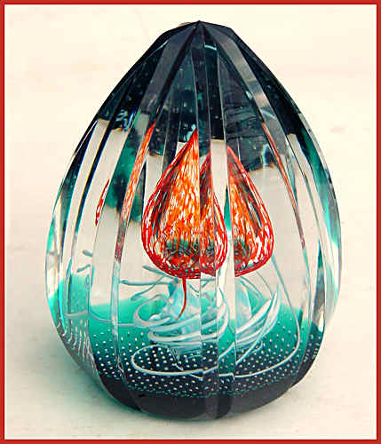 Caithness Glass: Gladiators paperweight (LE). Tall teardrop paperweight, designed by Gary Kean and made in a Limited Edition of 150 in 1997. Marked on base: "Caithness, Gladiators, Scotland, 86/150." Original certificate. Height: ~5". $300. (#ZL711) |