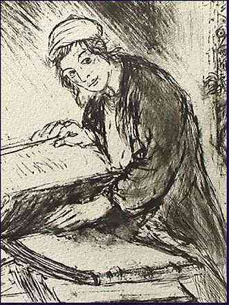 Composite picture of the two-volume Singer/Moskowitz folio (left) and one of the 24 etchings (Young Israel reading the forbidden old cabbala manuscripts in the musty attic) by Ira Moskowitz (right):