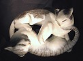 Rosenthal: Playful cats figurine. This vintage porcelain figurine, with its pair of cute grey and white cats (or kittens?) that are joyfully entwined, was designed by Rols. Schmitt. His name is impressed on the underside of the base and beneath the green underglazed Rosenthal mark is written “Kunstabteilung Factory Selb, Handgemalt”. This mark was used from 1935-1956. Condition is excellent. This is a hard to find and very cute figurine! Length: 8 ¾". SOLD. (#HT056) |