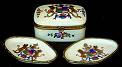 French hand-painted enamel box & 4 trays. Antique enameled (cigarette?) box and four small trays (or dishes), all colorfully decorated with a bright coat of arms with two lions. All surfaces of the box (except the bottom) are decorated and the gold metal (brass?) latch and rim around the box are finely detailed. The box is 4¼" (L), 3" (W) and 1¾" (H). Each of the trays, with their gold metal decorative rims are 4¾" (L). A fine 3-piece set of hand-painted French porcelain! $75. (#KR012) |