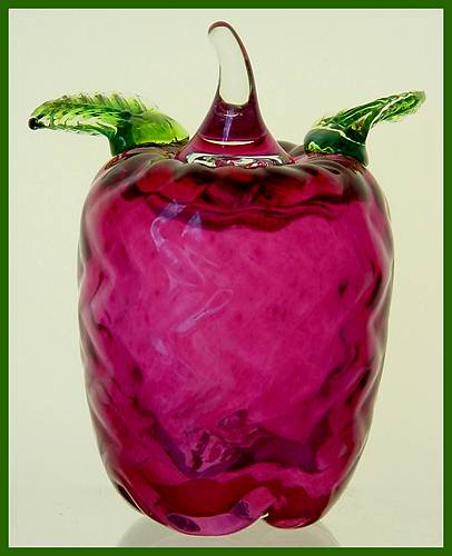 Carl Kraft 1975: Apple paperweight. Bright red apple paperweight with applied leaves and an interesting zig-zag patterned surface. Signed ("Kraft ‘75") on its polished base. Height is ~4". SOLD. (#J090) |