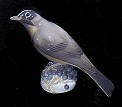 Royal Copenhagen: Redwing figurine (#1235) This European redwing bird, which looks similar to an American robin, was designed by Jais Nielsen, whose initials (JN) are found on the base beneath the tail of the bird. This beautiful bird stands on a pale green base amidst a cluster of grapes. The mark on its base indicates the figurine was made in 1957. Condition is excellent, except for a small linear chip on the underside of the bird’s bill, which is not visible in this photograph. Thus, the price is reduced. Height: 5½"; length: 8". SOLD. (#HT051) |