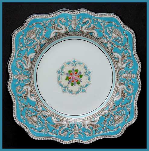 Wedgwood "Florentine" Turquoise Salad or desert plate. Unusual and hard to fine square salad or dessert plate in Wedgwood "Florentine" Turquoise. One of several 8¼ " plates, marked Wedgwood, with the Wedgwood Portland vase mark, W2714, and Made in England". $135. (#ES002) |