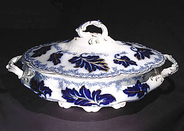 NORMANDY covered vegetable bowl. 9½" (length without handles) x 6" (width). The base has a blue Johnson Brothers mark and also has printed on it: "Patent Applied For". $150. (#L157) |